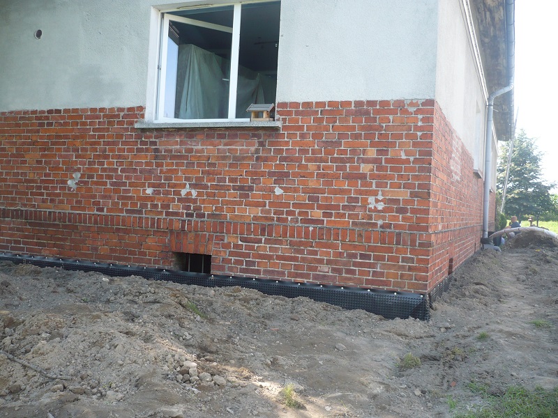 Odwodnienie budynku Lubomia w województwie Śląskim. Zastosowany drenaż opaskowy, w celu obniżenia lustra wody gruntowej ,zaizolowanie fundamentów masą bitumiczną, zamontowanie foli kubełkowej